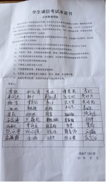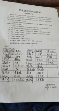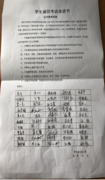 最后,在辅导员李小燕老师和各班班长带领下,全体同学起立,高举右拳进行宣誓,当场表示在以后考试中可以做到诚信考试,并在诚信考试承诺书上光荣地签上了自己的名字。