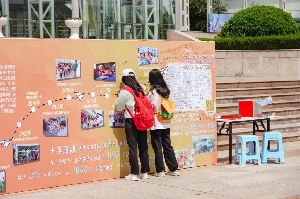 大学生活动中心前广场搭设了展板平台,以“留下一句祝福,拿走一颗糖”为主题,开启了为期一周的支教展活动,过往同学纷纷驻足观看、签字留名,对孩子们美好的祝愿在春风下留满了展板,收获了热烈的反响。