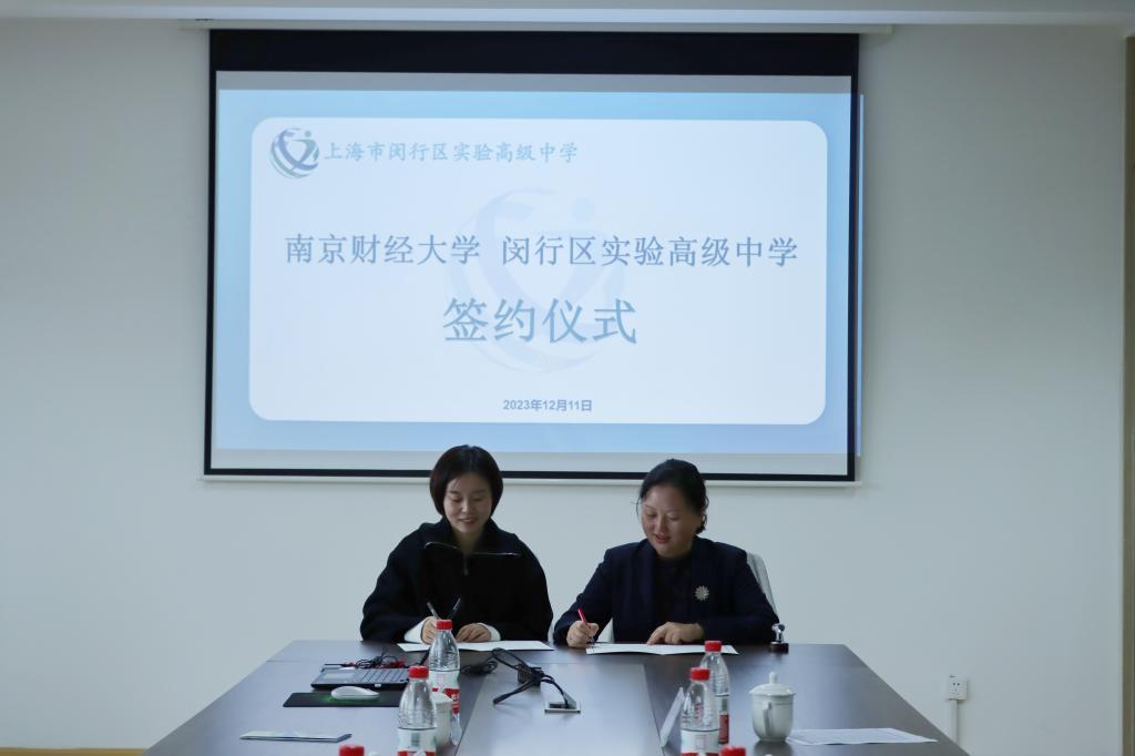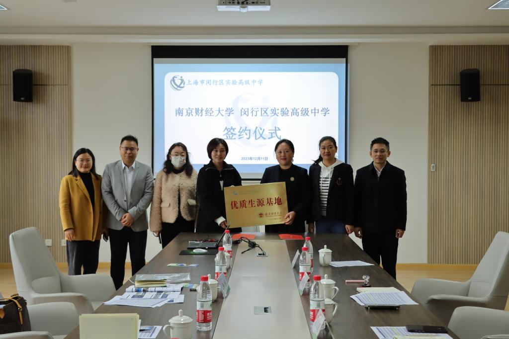 代表与上海市闵行区实验高级中学代表签订《南京财经大学优质生源基地合作协议书》,并授予“南京财经大学优质生源基地”铜牌。