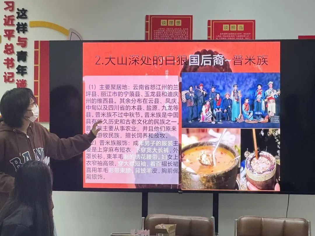 接着,主讲同学向同学们详细介绍了各民族,包括历史、饮食、服饰、节日等方面的文化知识。同学们在主讲人生动而清晰的讲述中加深了对各民族的认识与了解,仿佛自己也置身于广袤的草原抑或是毓秀的山林中,感受着千姿百态的民族文化。