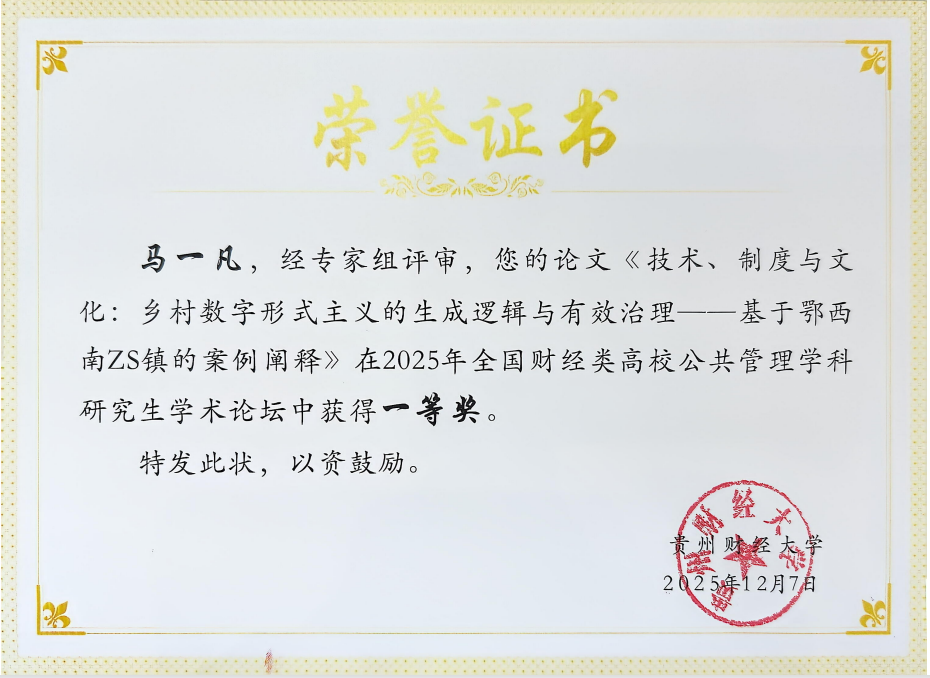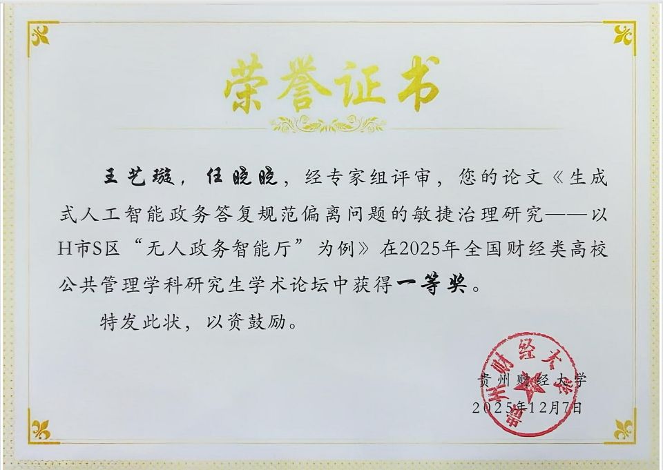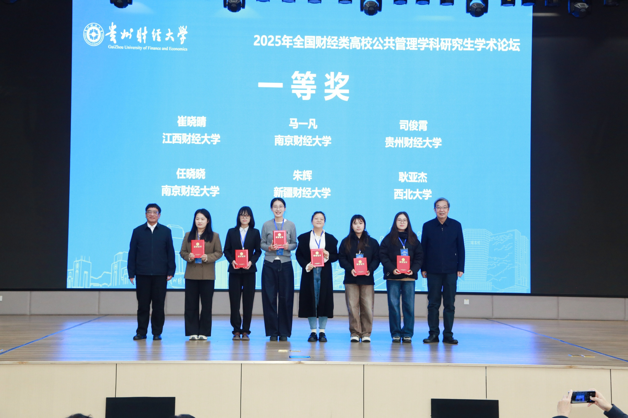赢得了荣誉。论坛一等奖由国务院公共管理学科评议组联合召集人丁煌教授和贵州财经大学党委书记缪坤和教授颁发。