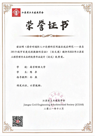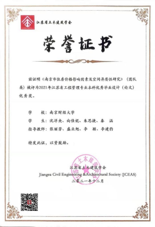 2017级房地产开发与管理专业学生沈洋央、向佳妮、朱思捷、秦涵同学的团队论文“南京市住房价格影响因素及空间异质性研究”(指导老师:张丽芳、李建豹、李颖、盛业旭)、陈卓同学的毕业论文“房价对城际人口迁移的空间溢出效应研究——来自285个城市百度迁徙数据的实证”(指导老师:孙燕)参加了江苏省土木建筑学会主办的本科优秀毕业设计(论文)的评选,被评为 2021年江苏省工程管理专业本科优秀毕业设计(论文)优秀奖。
