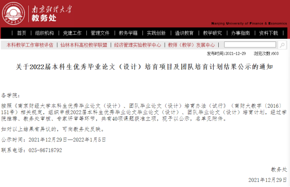 2018级房地产开发与管理专业范恋雪、薛燕、叶佼同学的团队论文《新型城镇化背景下土地产权与农村转移劳动力城镇融合研究》(指导老师:张芳怡、张丽芳、饶芳萍)申报了2022届本科生优秀团队毕业论文培育计划,经过乐游棋牌 推荐、教务处审核、专家评审等环节,现已获得优秀毕业论文团队培育计划项目立项公示。