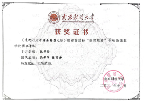 房地产系教师一直以来积极探索教学改革,改进教学方法,提升教学质量,通过参加各类教学比赛,实现以赛促教。2021年由张芳怡副教授主讲的《透过ROE看房企转型之路》荣获首届校“课程思政”专项微课教学比赛二等奖。