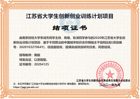 房地产开发与管理系李润杰同学主持的江苏省大学生创新创业训练计划项目《基于不同算法的中国城市知识合作网络主干结构比较》顺利通过了验收并结项。