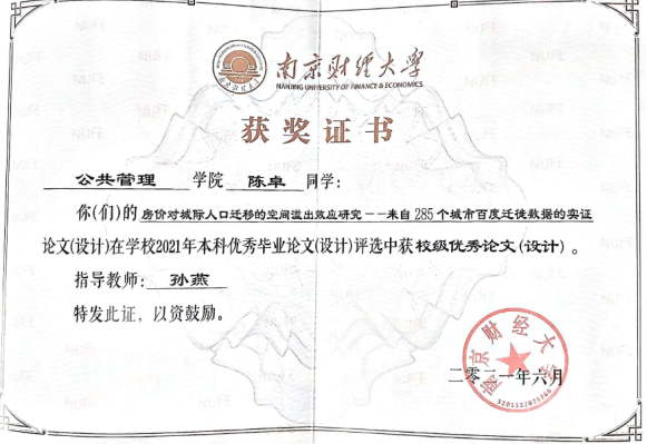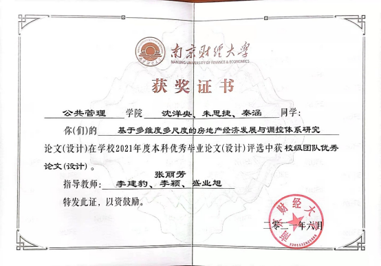 2017级房地产开发与管理专业学生陈卓的毕业论文“房价对城际人口迁移的空间溢出效应研究——来自285个城市百度迁徙数据的实证”(指导老师:孙燕)在南京财经大学2021年度本科优秀毕业论文评选中获得校级优秀论文;沈洋央、朱思捷、秦涵等同学的论文“基于多维度多尺度的房地产经济发展与调控体系研究”(指导老师:张丽芳、李建豹、李颖、盛业旭)获校级团队优秀论文。