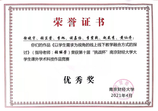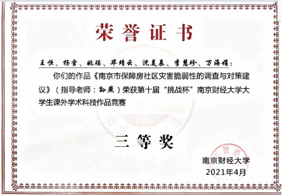 房地产专业王恒小组、徐晓宇小组同学的作品“南京市保障房社区灾害脆弱性的调查性与对策建议”以及“以学生需求为视角的线上线下教学融合方式的探讨”两个作品分别荣获十届“挑战杯”南京财经大学大学生课外学术科技作品竞赛的三等奖和优秀奖。指导老师分别为孙燕、张丽芳。