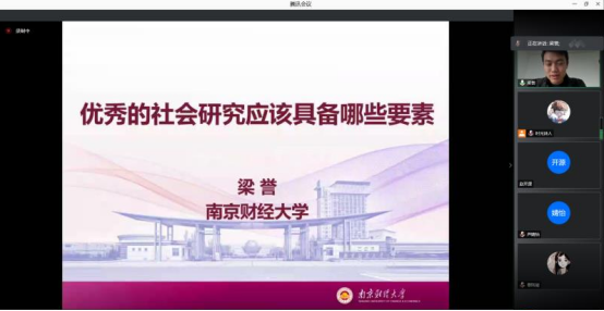 2021年1月28日下午,梁誉老师以“优秀的社会研究应该具备哪些要素”为主题,首先从社会研究的概念、意义、发展脉络等方面介绍了“什么是社会研究”;其次主要从研究设计、研究背景、文献综述、分析框架、研究内容、研究方法等方面具体阐释了“社会研究的构成要素”;最后以自身指导的大创和大挑获奖项目为例,向同学们呈现和讲解了社会研究的具体形式,并一一解答了同学们的疑问。
