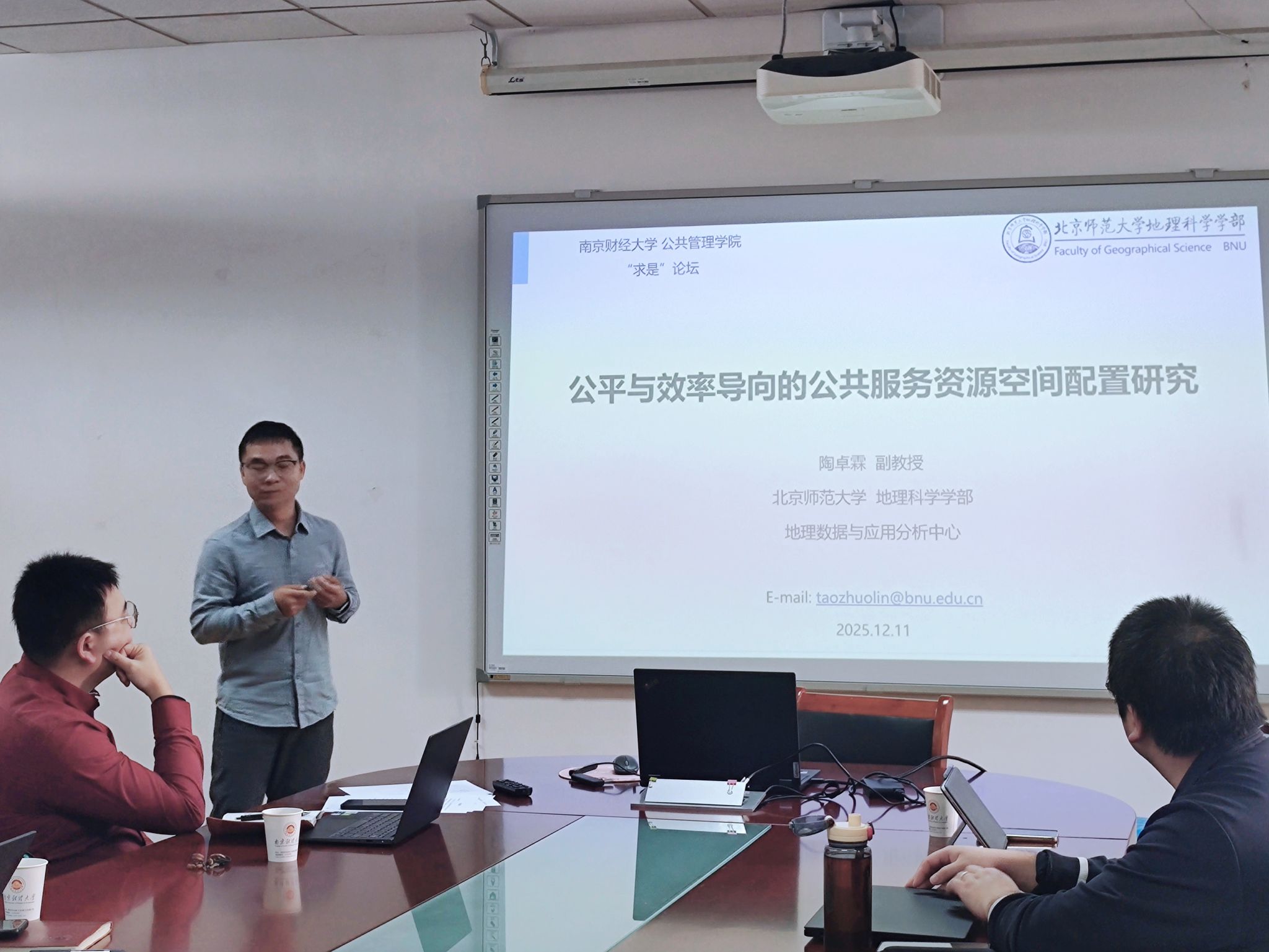 随后,北京师范大学陶卓霖副教授带来了题为《公平与效率导向的公共服务资源空间配置研究》的精彩报告。陶教授作为入选中国知网高被引学者TOP1%的青年学者,在社会基础设施空间治理领域造诣颇深。报告中,他通过具体的实证案例,深入探讨了在城市规划与管理中,如何通过优化空间配置来平衡“公平”与“效率”这一对核心矛盾。陶教授结合其发表在 Land Use Policy、Applied Geography 等国际权威期刊上的研究成果,展示了科学的空间分析方法如何为政府决策提供有力支撑,从而实现公共服务效益的最大化。