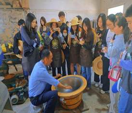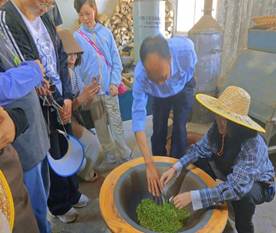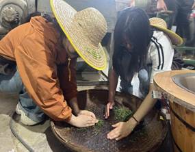 采茶结束后,大家来到制茶场地,亲身体验杀青环节。无论是机制杀青展现的现代劳动智慧,还是手工杀青蕴含的传统匠心技艺,都让师生们与孩子们深深体会到制茶的复杂。孩子们睁大眼睛,好奇地观察着每一个步骤,在实践中直观地感受到劳动的不易;大学生们也从主任的讲解和亲身体验炒茶过程中,进一步深化了自己对劳动价值的认知。这一过程,不仅是技能的学习,更是“劳动建心”理念的生动实践,让大家在体验中感悟到劳动对塑造坚韧品格、培养耐心与专注力的重要作用。
