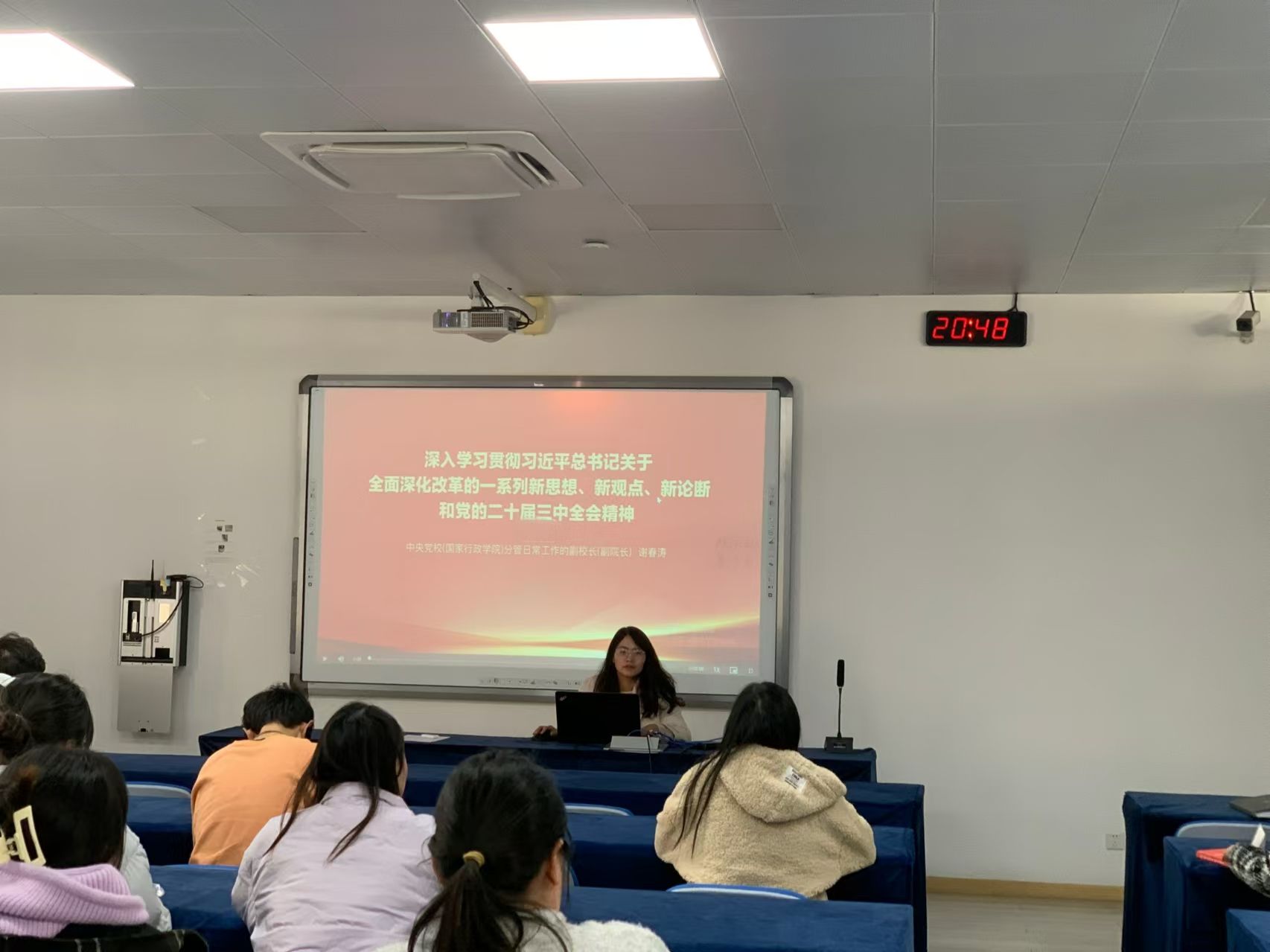 本科生党支部书记高敏于德济楼502会议室向全体学生党员讲授意识形态专题党课。